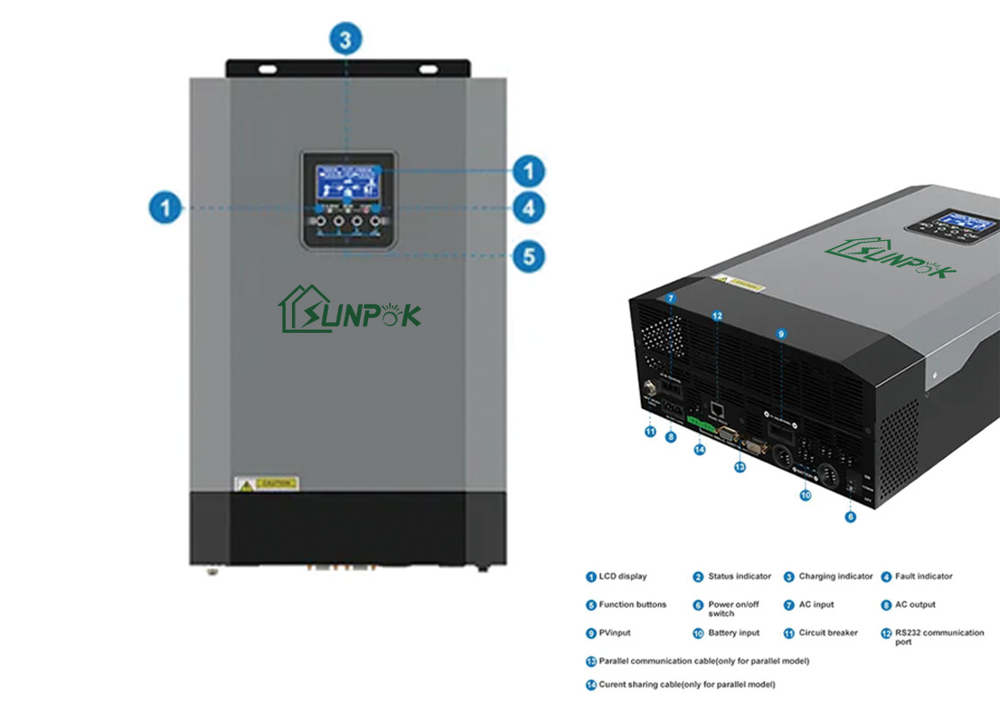 Sunpok 5Kw সিঙ্গেল-ফেজ হাই-ফ্রিকোয়েন্সি অফ-গ্রিড ইনভার্টার বিদ্যুৎহীন এলাকা, যাযাবর এলাকা, যোগাযোগ বেস স্টেশন, অস্থির শক্তি আছে এমন এলাকা, দ্বীপ, সীমান্ত পোস্ট, প্রাকৃতিক ব্যবস্থাপনা অফিস, নিউজস্ট্যান্ড, ব্যাটারি নির্মাতাদের জন্য ব্যাটারি প্যাক ইত্যাদির জন্য উপযুক্ত। LED ডিসপ্লে দিয়ে সজ্জিত, USB/RS232/RS485/Bluetooth/Dry-contact, কমপ্যাক্ট ডিজাইন এবং উচ্চ-মূল্যের কর্মক্ষমতা সমর্থন করে।